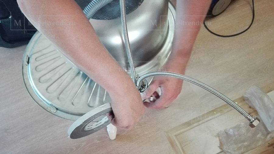 Шаг 4. После того, как герметик застынет, приступаем к подключению мойки. Процесс подвода коммуникаций начнем с подключения к трубам горячей и холодной воды. Порядок монтажа смесителя одинаков для всех видов. Чтобы повысить комфорт вы можете установить кухонный смеситель с выдвижным душем или выбрать смеситель со встроенным терморегулятором. Для обеспечения плотной установки смесителя на раковину потребуется резиновая прокладка. Подключите шланги подачи воды к системе, концы выведите в специальное отверстие на мойке. Присоедините их к смесителю и проверьте герметичность соединений.