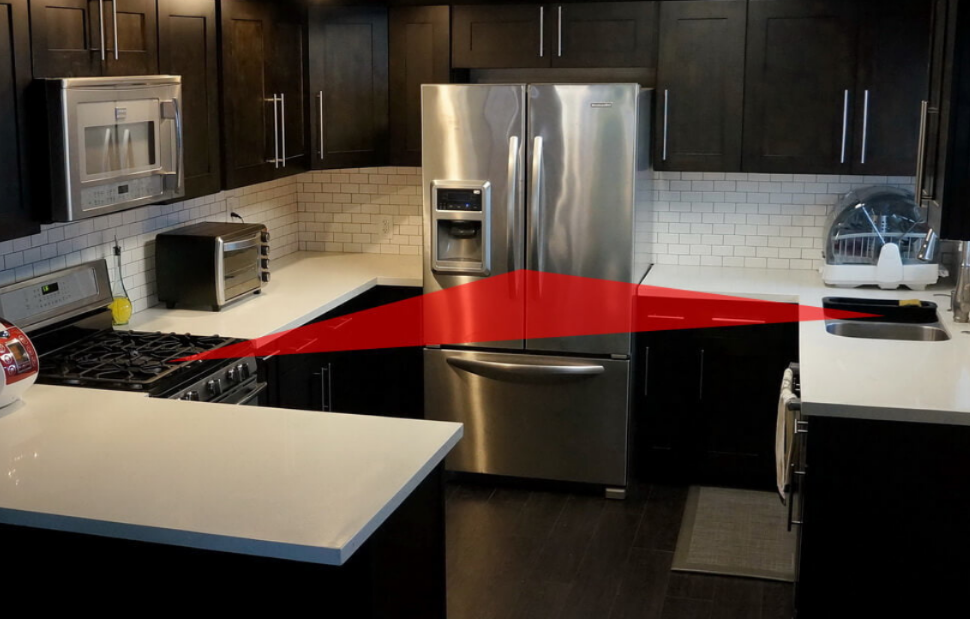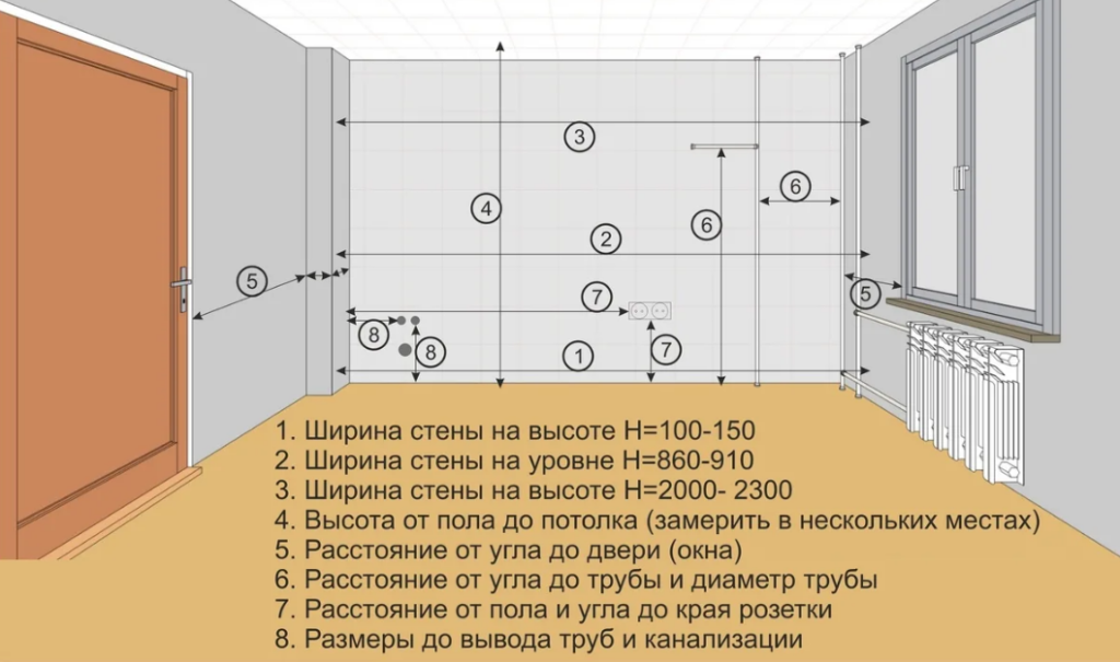 Измерять помещение стоит рулеткой или лазерным дальномером. Если кухонная мебель будет располагаться между стен, тогда стоит проводить измерение стен по высоте, расстояние между ними, диагональ. Стоит учитывать, что поверхности могут быть неровными. Когда замеры готовы, их переносят в конструктор, располагают окна, двери, розетки, воздуховоды.
