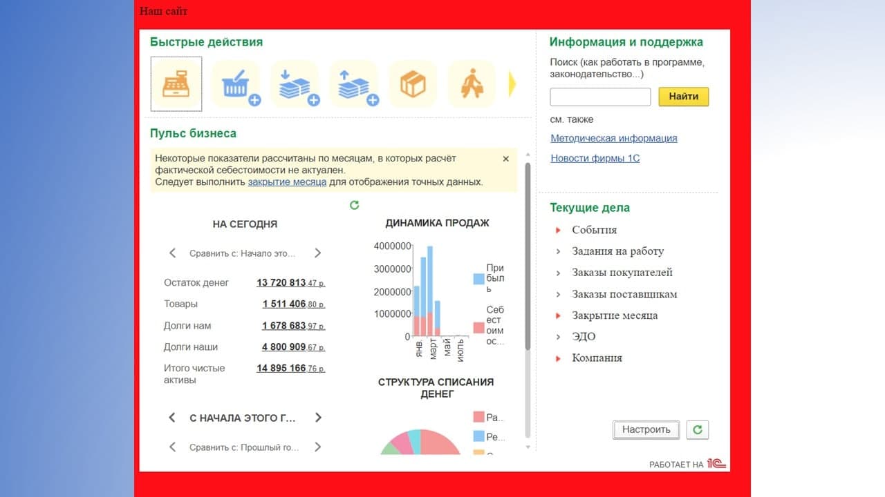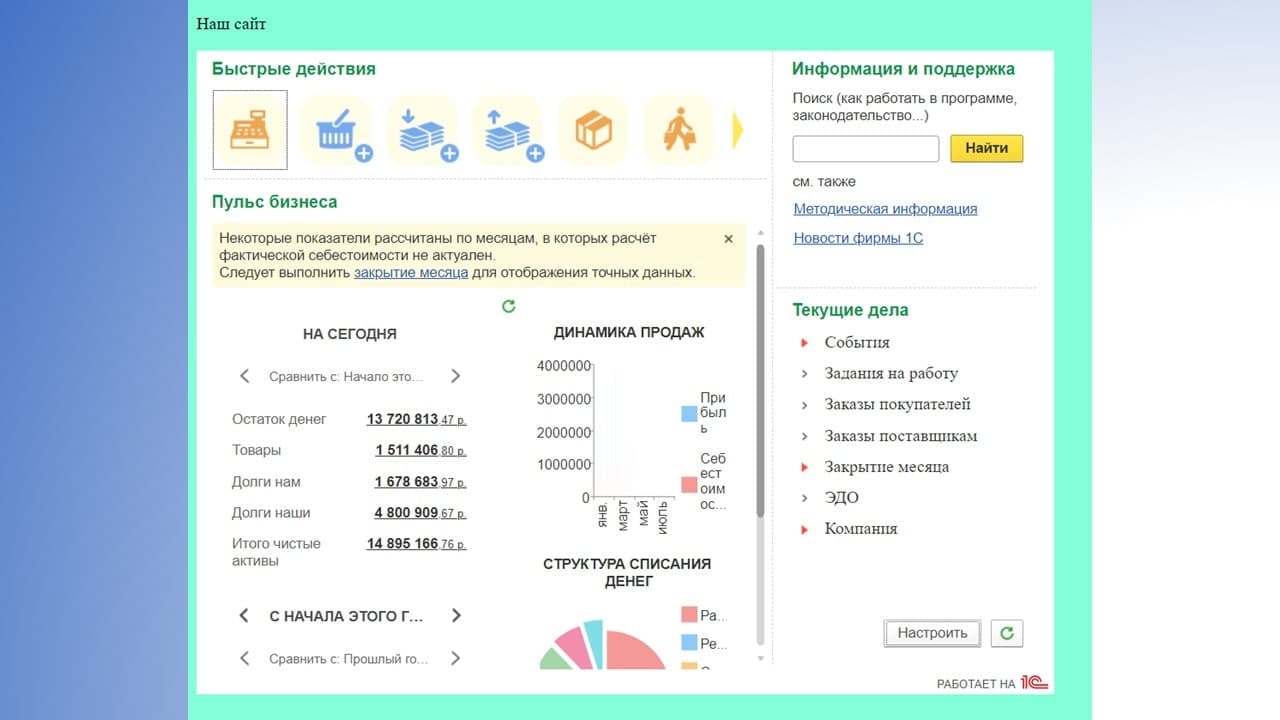 Внизу появляется надпись «Работает на 1С». Фирма 1С свой бренд всегда продвигает, поэтому даже если мы убрали все ненужное, то момент, что система работает на 1С, мы оставляем.