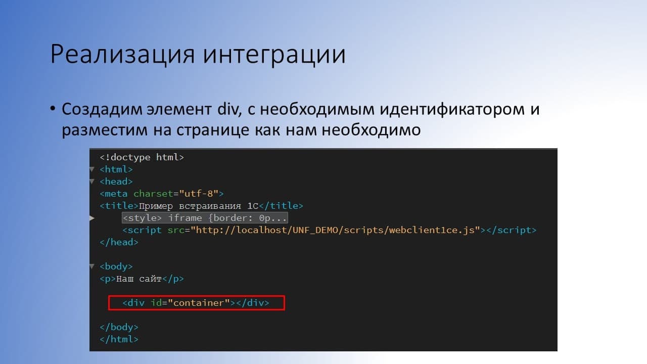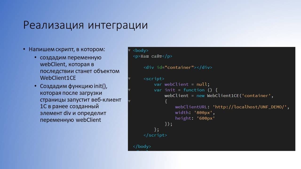 Затем создадим функцию init(). В данном случае, функция init() загружает веб-клиент с определенными параметрами в div с id=“container”.
