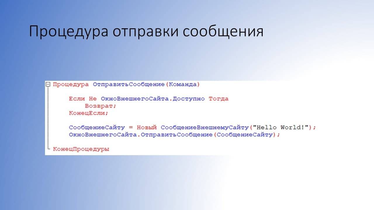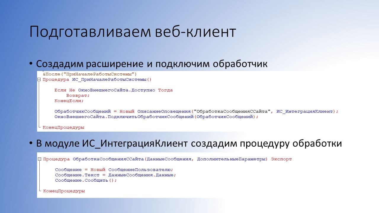 Мы в обработчике ПриНачалеРаботыСистемы проверяем, что у нас 1С запущена внутри сайта, и, если это так, мы в ОкноВнешнегоСайта подключаем обработчик сообщений и указываем имя процедуры, которая будет выполняться.