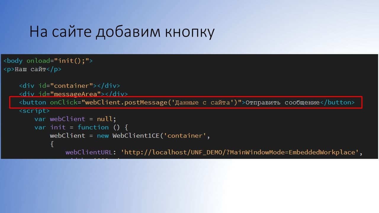 Затем мы на сайте добавили кнопку с обработчиком webClient.postMessage («Данные с сайта») – при ее нажатии у нас будет выполняться данный метод.
