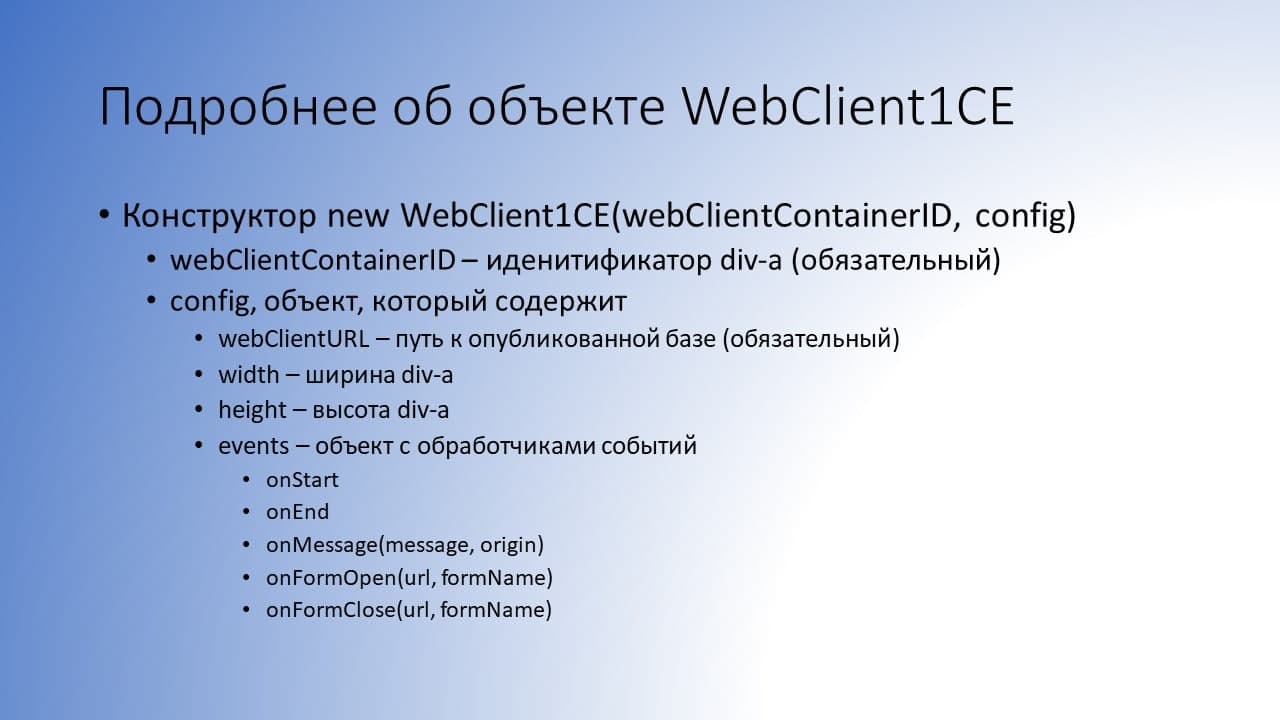 У конструктора new WebClient1CE, который мы вызываем при создании веб-клиента 1С на странице сайта, есть два параметра.