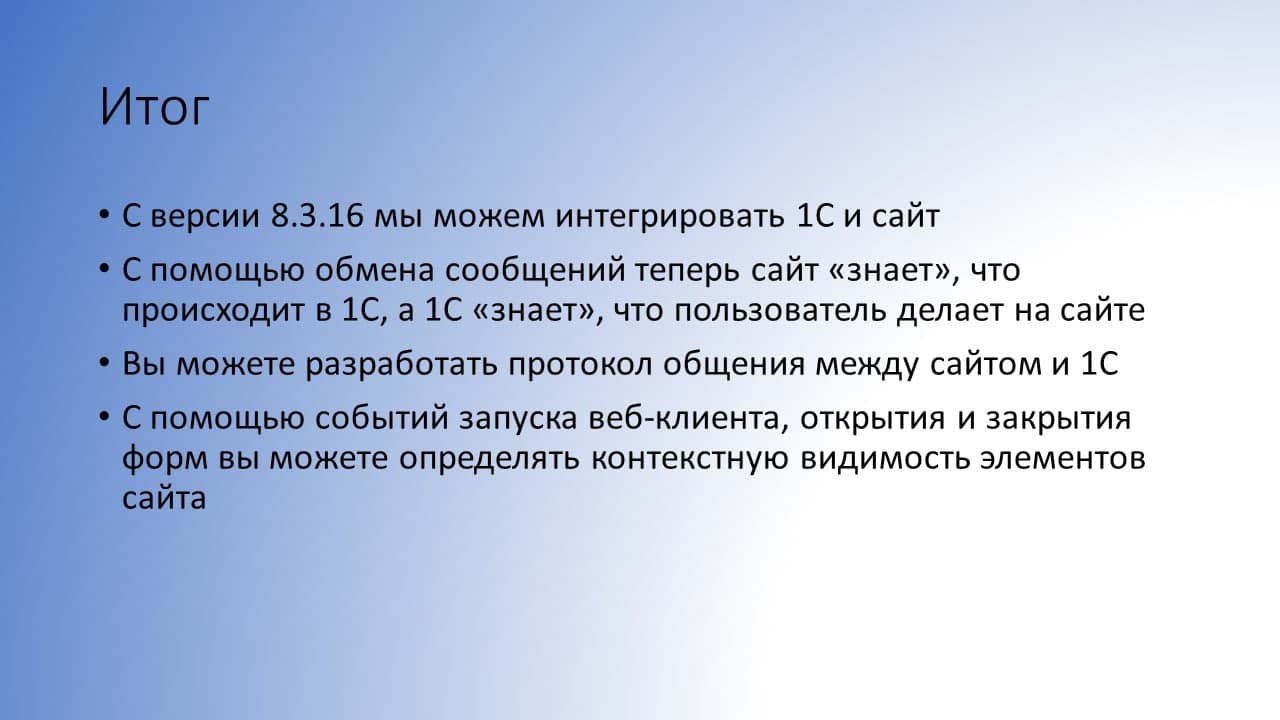 И непонятно, почему сделан специальный конструктор, почему не сделать просто ОкноВнешнегоСайта.ОтправитьСообщение, а внутри текст. У меня предположение, что все-таки у разработчиков 1С были какие-то планы расширить эту возможность. Потому что практика показывает, что даже если взять систему взаимодействия, там тоже все менялось: раньше можно было передавать только строки сообщений, сейчас уже больше различных типов передавать. Поэтому надеюсь, что возможно когда-то что-то будет добавлено. Но пока только текст.