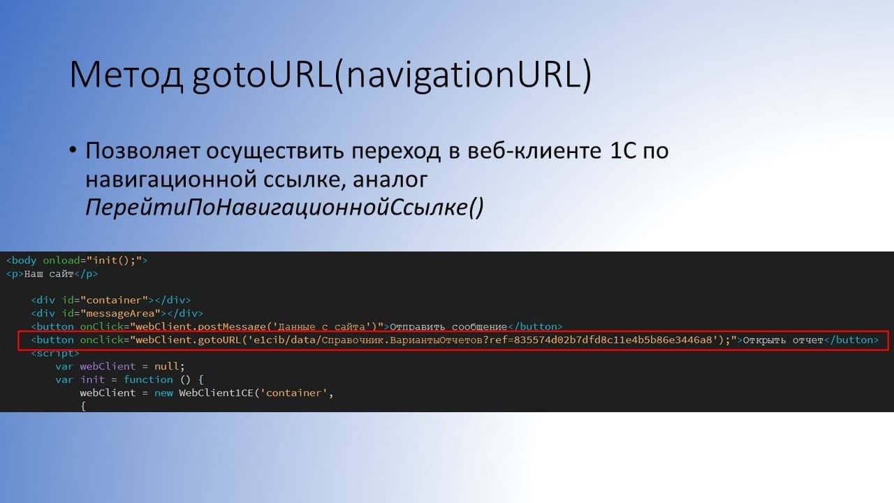 Следующий метод, который есть в объекте WebClient1CE, – это gotoURL. В качестве параметра этого метода мы указываем стандартную навигационную ссылку. Это, по сути, аналог ПерейтиПоНавигационнойСсылке на встроенном языке 1С.