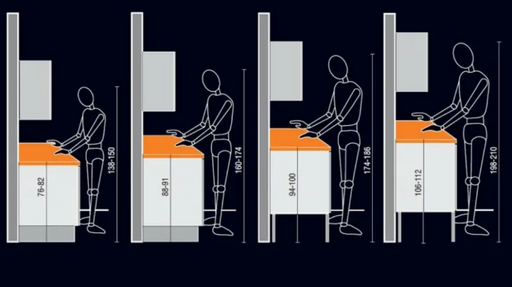 В этом случае нужно предусмотреть высоту и ширину рабочих поверхностей. Этот параметр учитывается в соответствии с ростом работающей за ней женщины. Это может быть 86-91 см.