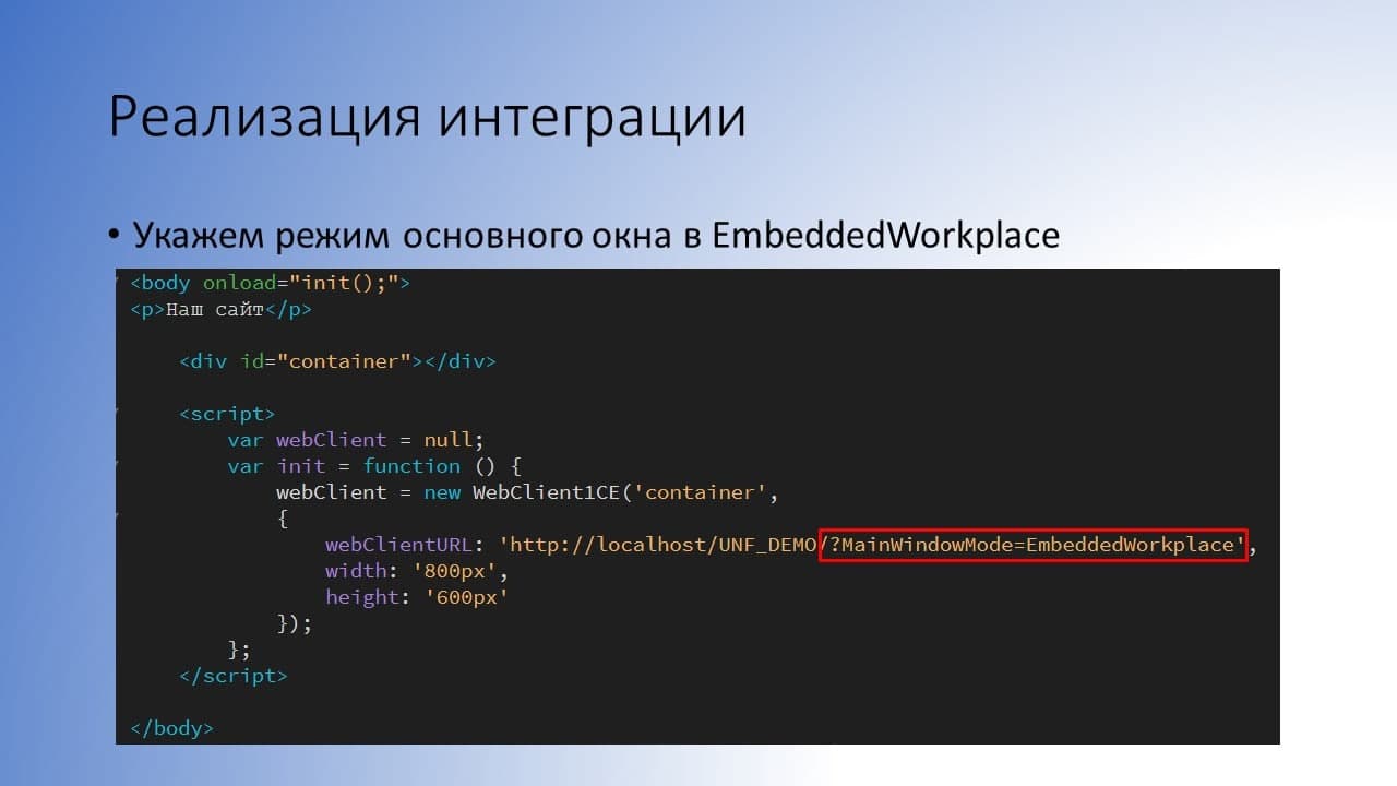 Поэтому следующее, что мы сделаем, – пропишем режим основного окна EmbeddedWorkplace и посмотрим, как теперь будет работать.