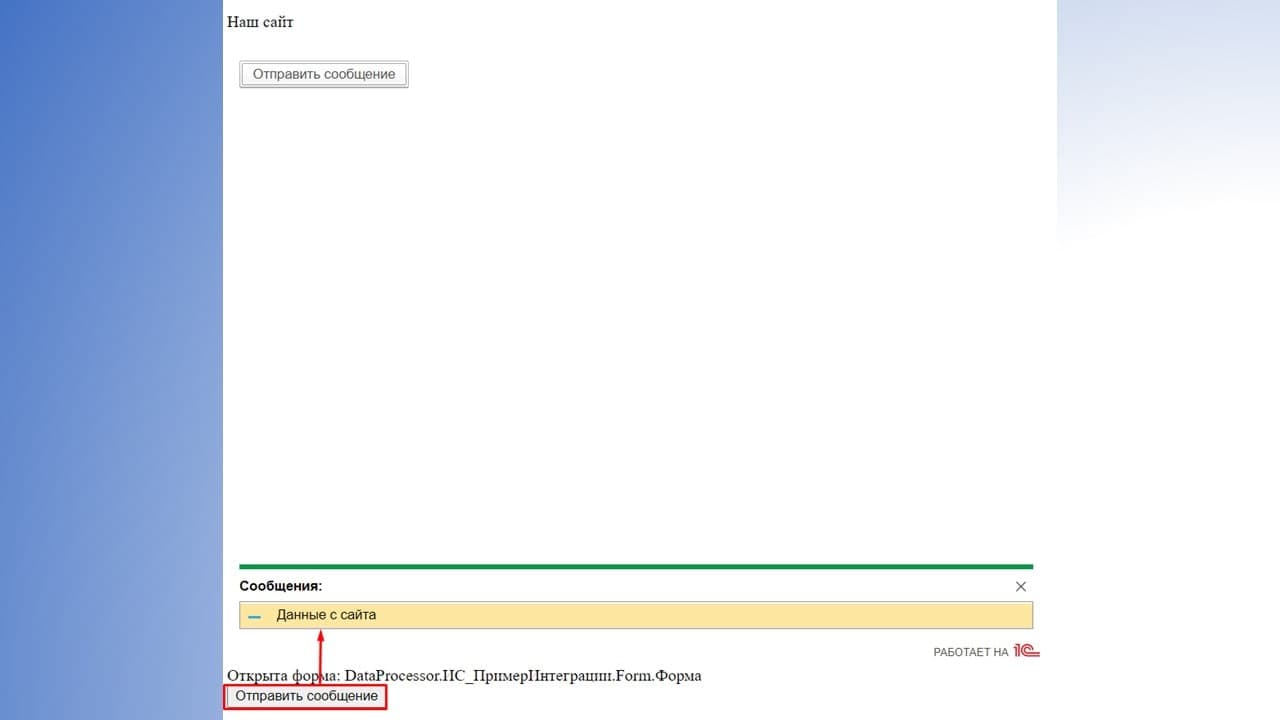 Как это работает? Мы открыли сайт, нажали кнопку «Отправить сообщение», и появилось сообщение «Данные с сайта», т.е. 1С его получила и выполнила ту логику, которая у нас запрограммирована.
