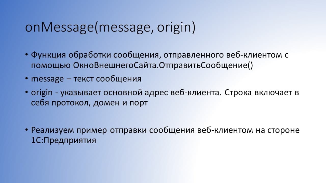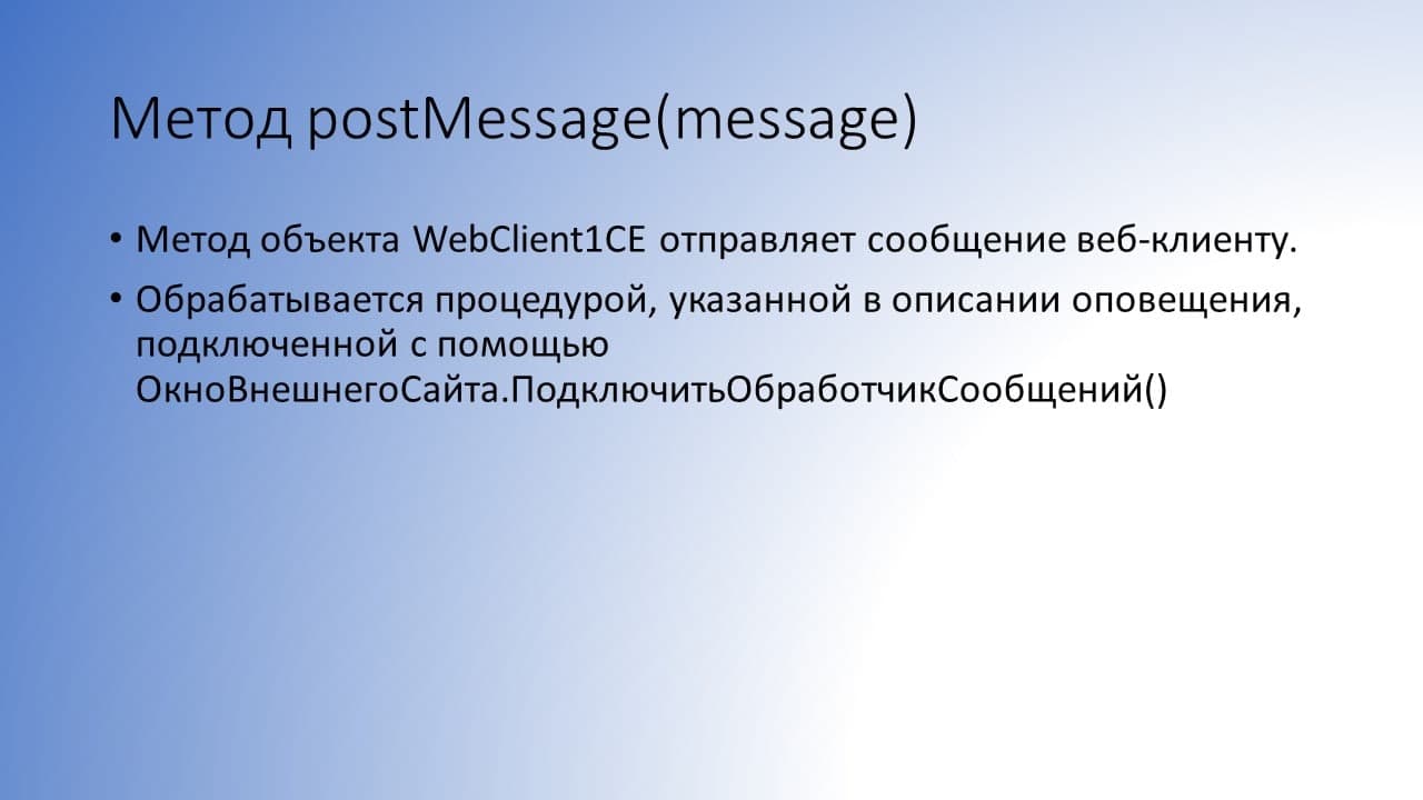 У нашего объекта WebClient1CE есть ряд методов. Первый метод, который мы рассмотрим – это postMessage, с его помощью уже внешний сайт может отправить 1С свое сообщение.