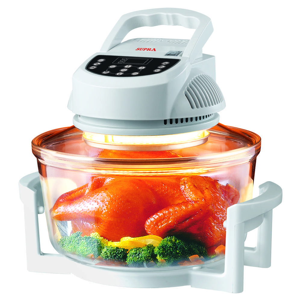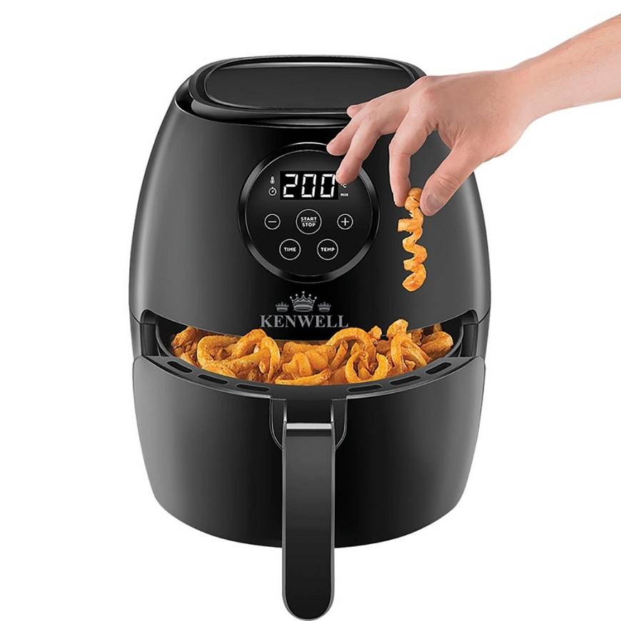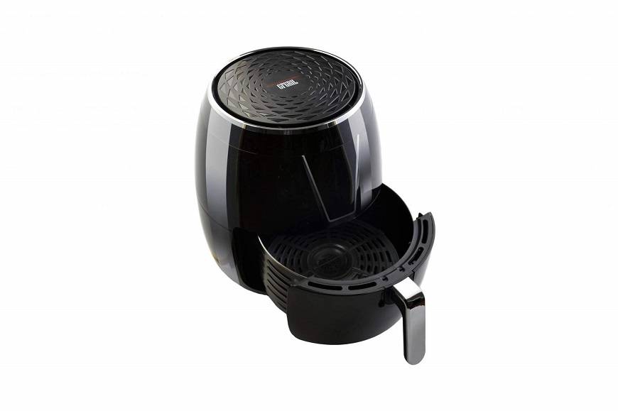 Бюджетное устройство поставляется в богатой комплектации, с низкой, высокой и двойной решетками, расширяющим кольцом, позволяющим увеличить объем колбы на 3 л, с щипцами и шампурами. Аэрогриль довольно мощный, базовая вместительность составляет 12 л, колба выполнена из термостойкого стекла. Крышка у устройства съемная, управление — электронное, есть режим самостоятельной очистки.
