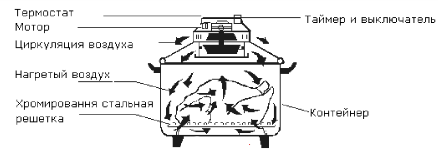 | Продукты готовятся под воздействием потоков горячего воздуха | Продукты просто поджариваются на специальной решётке |