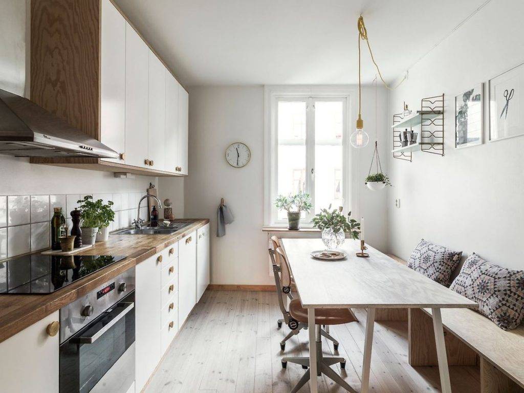Кухня идеально впишется в узкое и малогабаритное помещение от 6 до 12 м2, ширина которого менее 2 м. В таком варианте предусматривают выдвижную систему для посуды, навесные шкафы – для продуктов. Чтобы не загружать пространство, покупают встраиваемую технику, между холодильником, мойкой и плитой располагают рабочие столы, на противоположной стороне размещают складной или пристенный, откидной стол.