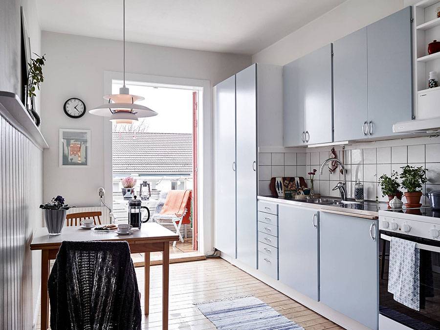 Для небольшой кухни вполне будет достаточно иметь одну напольную тумбу, шкаф-пенал и навесной шкафчик. При правильном расположении небольшое количество предметов гармонично впишутся в интерьер. В зависимости от площади кухни возможно выбрать встраиваемую кухню или модульную.