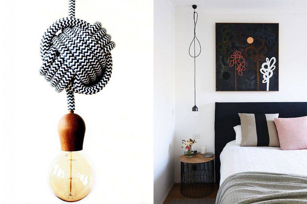 Эффектно смотрятся подвесные светильники с проводами в текстильной оплетке. Это может быть витой провод или простой круглый провод в оплетке. Количество цветовых вариантов огромно!