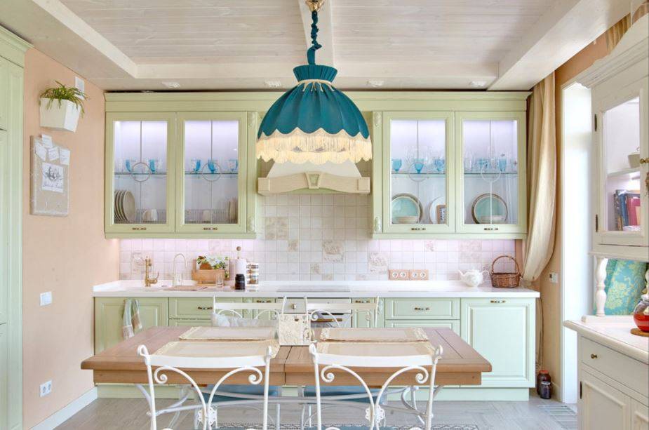 Европейский интерьер разбавят люстры с плафонами в виде бутонов, свечей, шаров, выполненных из цветного стекла. Отличный выбор для кухни в итальянском или прованском стиле.
