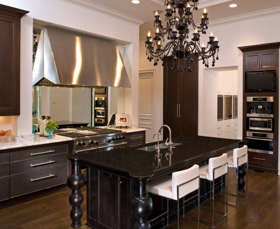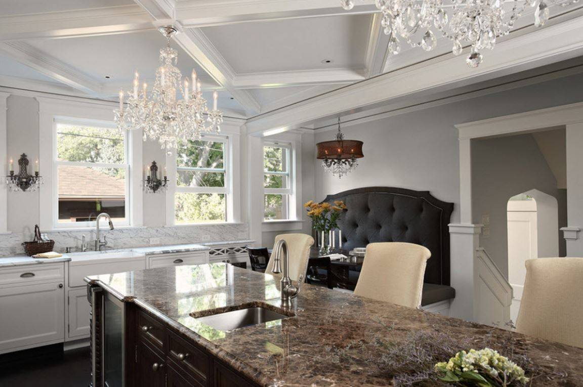 - Классические. Такие люстры принято размещать в гостиной комнате. Это подвесные светильники с несколькими лампами. Однако для кухонного интерьера такие осветительные приборы также отлично подходят. Это оригинальный и экстравагантный вариант, который подойдет для комнаты с высоким потолком. Даже самое скромное помещение с классическими люстрами становится изящным.