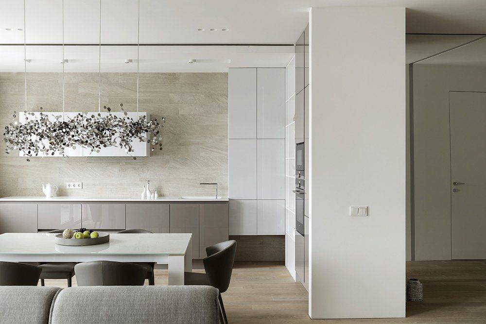 Точечное освещение используют в стилях хай-тек, модерн или лофт. Лаконичные приборы с плафонами из металла или стекла располагают по периметру потолка (необходимость вешать большую люстру отпадает). Нередко устанавливают светильники только в зоне плиты, стола, гарнитура.