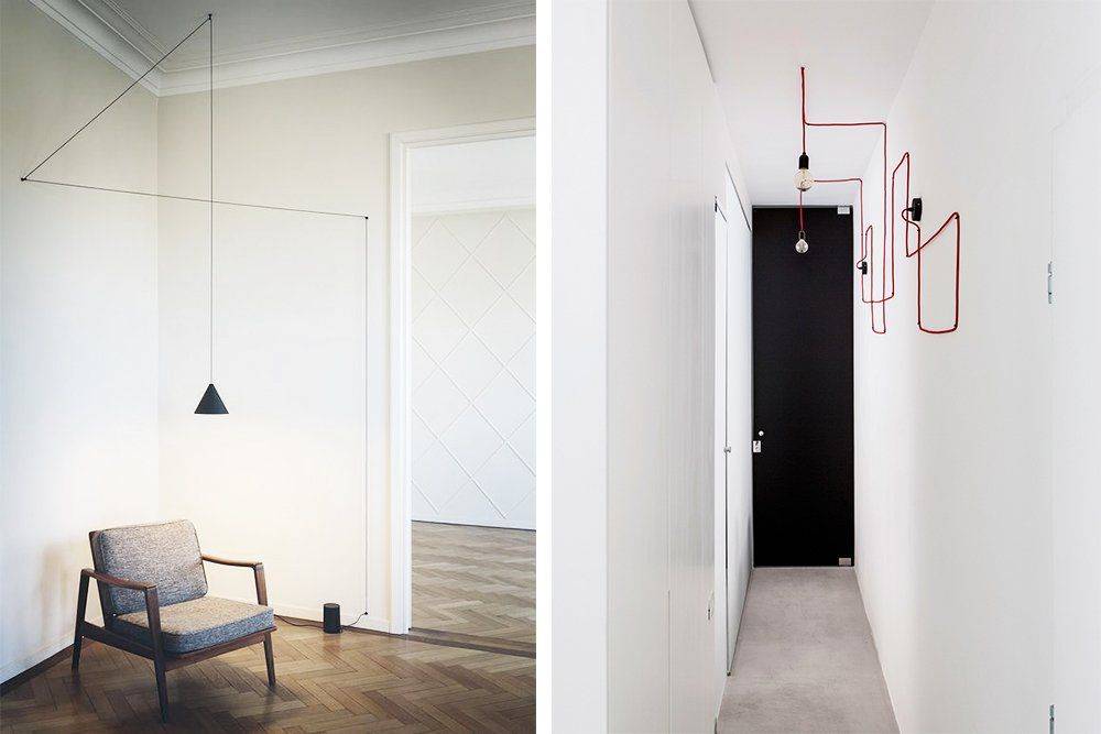 Интересным элементом дизайна может стать открытая проводка. Прикрепите ее к поверхности стены или потолка клипсами для открытой проводки, если кабель витой – с помощью изоляторов.
