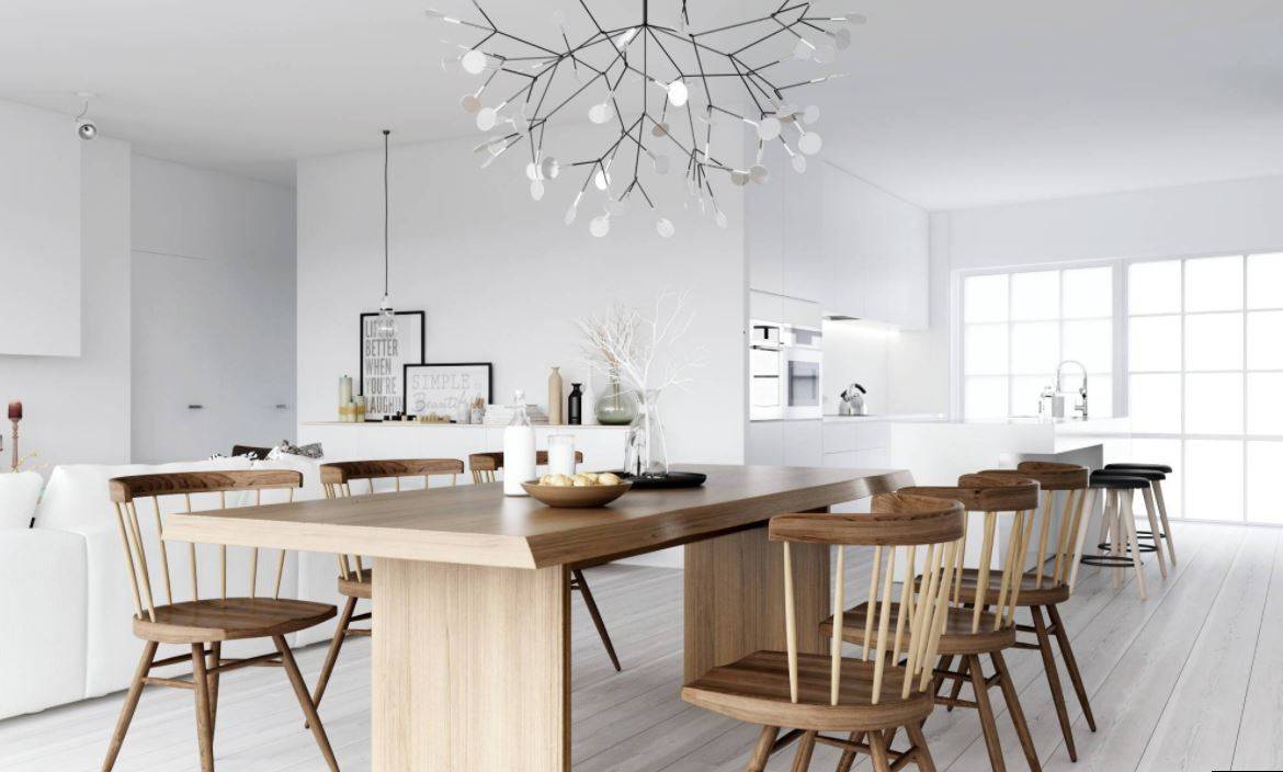 Если используете в качестве основного освещения потолочный светильник или люстру по центру кухни, не вешайте над столовой группой подвесные светильники! Они будут “спорить” друг с другом. Лучшим решением послужат бра.