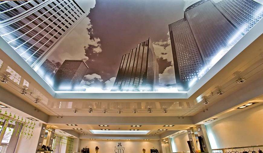 Потолок может служить продолжением общей концепции комнаты или стать неповторимым произведением искусства. На поверхность можно нанести необыкновенный узор, орнамент или даже фотографии.