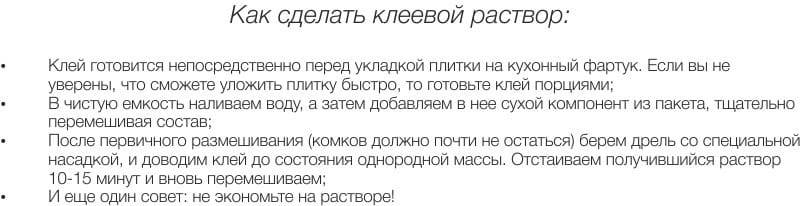Шаг 2. После нанесения разметки нужно сделать своими руками клеевой раствор. Если смесь приготовить неверно, с нарушениями рекомендаций производителя, то она очень быстро разрушится и фартук отпадет.
