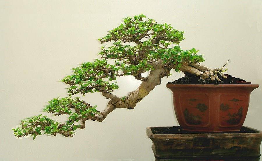 В качестве бонсая подходит растение эреция. Оно имеет развитую корневую систему. Кора у эреции светлая, листья – опущенные. В природе встречаются миниатюрные разновидности, их длина – не более 20 см. Другие виды достигают 70 см. Растение требует ежедневного ухода. Чтобы оно не разрасталось, необходимо корректировать. Эреция имеет коричнево-серую кору, на которой сформированы красивые разрезы. Эти разрезы подчеркивают красоту ствола и ветвей. Листья у эреции темно-зеленые, цветы – белоснежные.