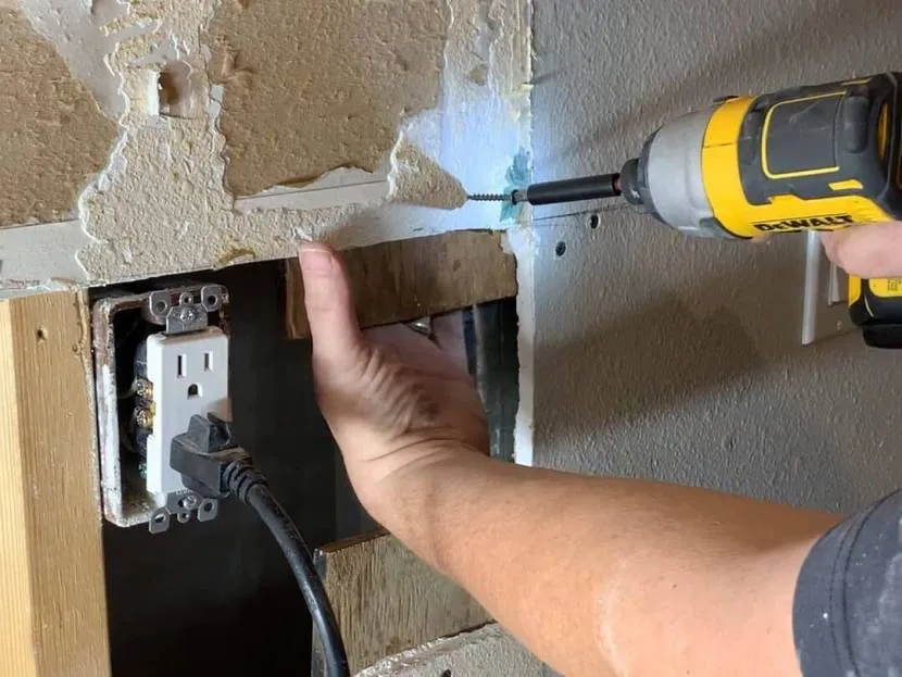- Крепят вырезанный по форме и размеру фрагмент гипсокартона. Шляпки саморезов на 1 – 2 мм утапливают в сухую штукатурку.