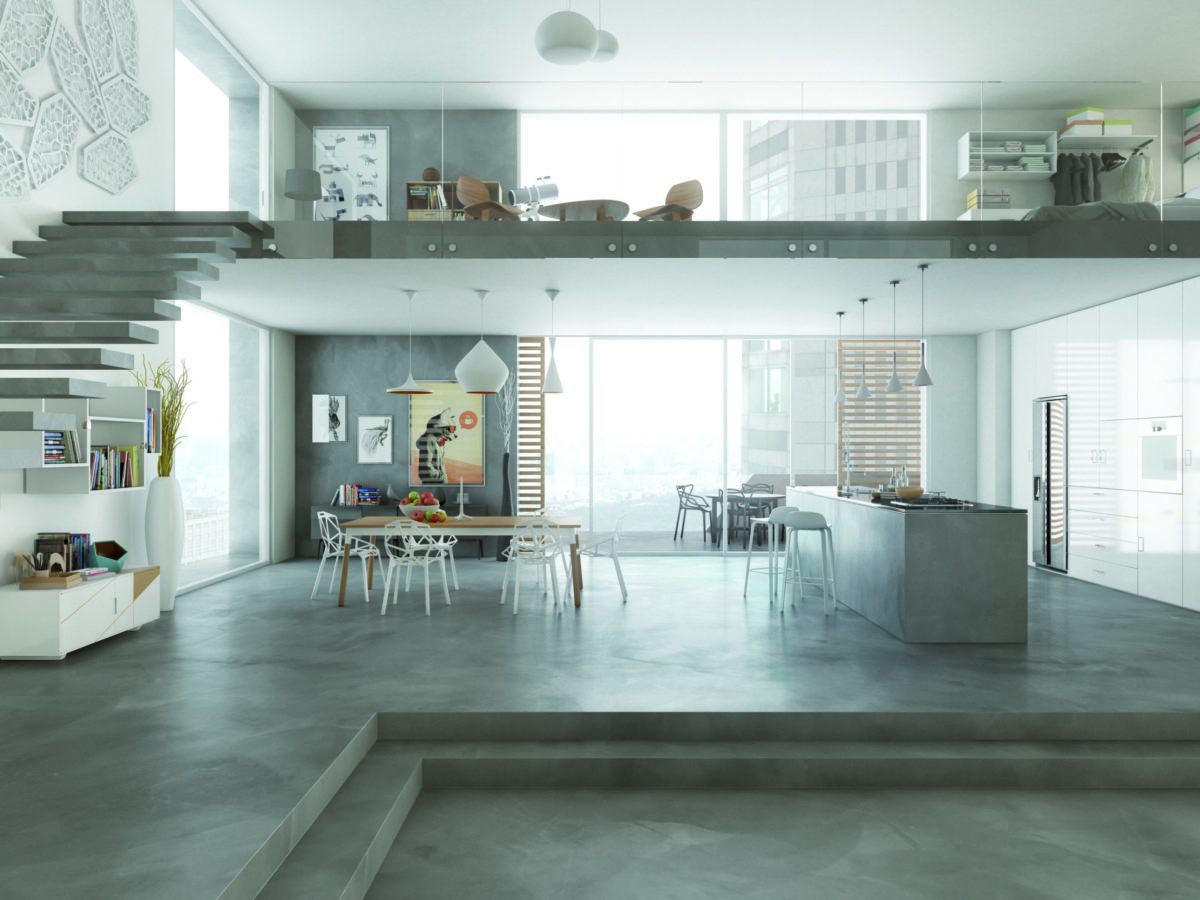 Бетонные полы идеально сочетаются с минималистским интерьером с большими застекленными площадями, а также с дизайном в промышленном и чердачном стиле. Гладкие бетонные поверхности оптически увеличивают пространство, обеспечивают отличный нейтральный фон для кухонной мебели и аксессуаров. Они прекрасно сочетаются с любым видом дерева. С помощью специальной краски вы можете покрасить такой пол целиком или по рисунку, используя шаблон.