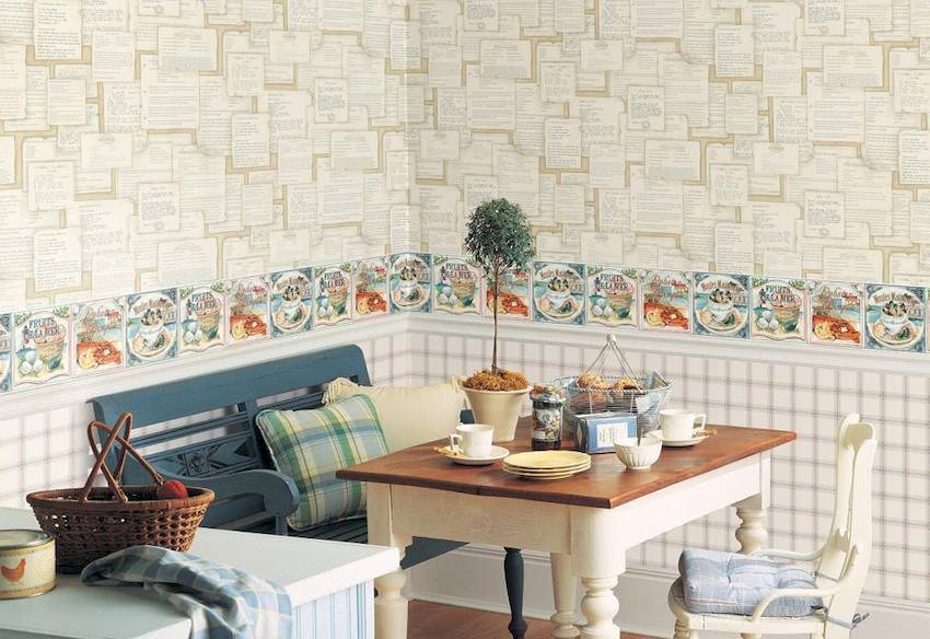 Если флористические мотивы не нравятся, можно использовать обои с изображением фруктов или овощей, виноградников, украсить поверхности клетчатой расцветкой в светлых тонах. Деревенская тематика может быть подчеркнута обоями с имитацией рогожки, каменной кладки или дерева.
