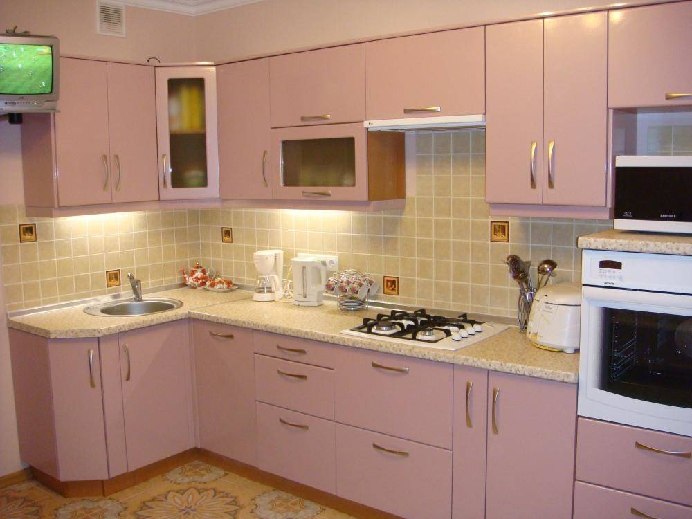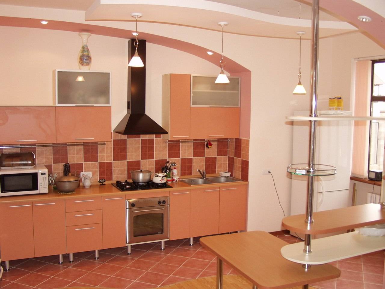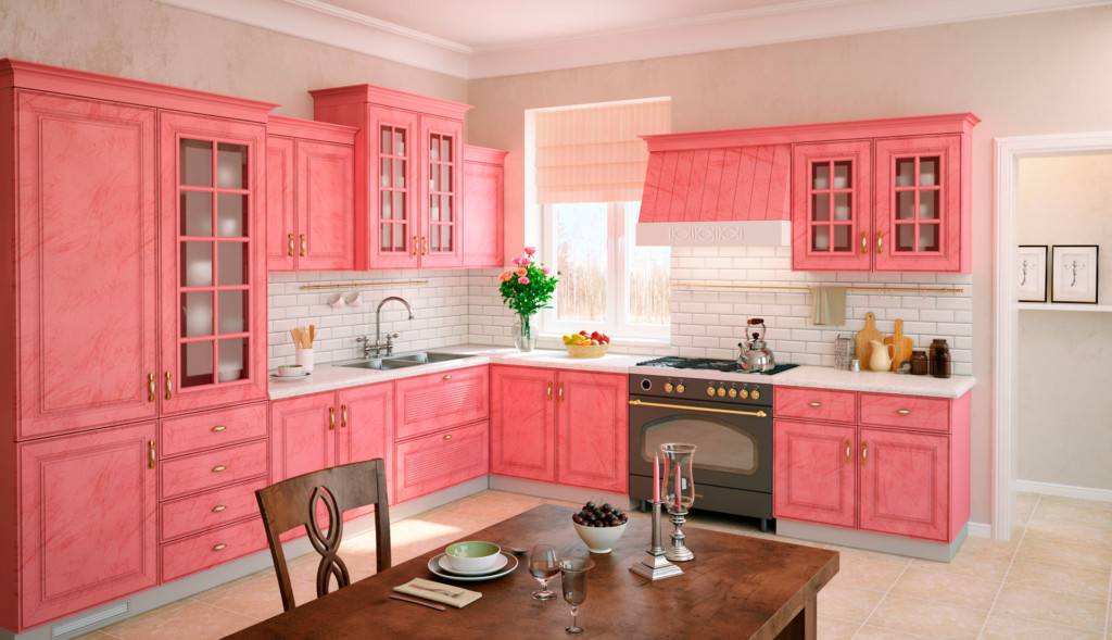 Светло – персиковые и розовые оттенки. Такая комбинация встречается на кухнях чаще всего. Оба эти оттенка смотрятся гармонично и дополняют друг друга. При правильно продуманном освещении, помещение станет необычайно теплым и уютным. Здесь главное, чтобы люстра не освещала сразу все углы, а яркие акценты расставляются на предметах декора. Хорошим выбором станет установка ярко – красной вазы.