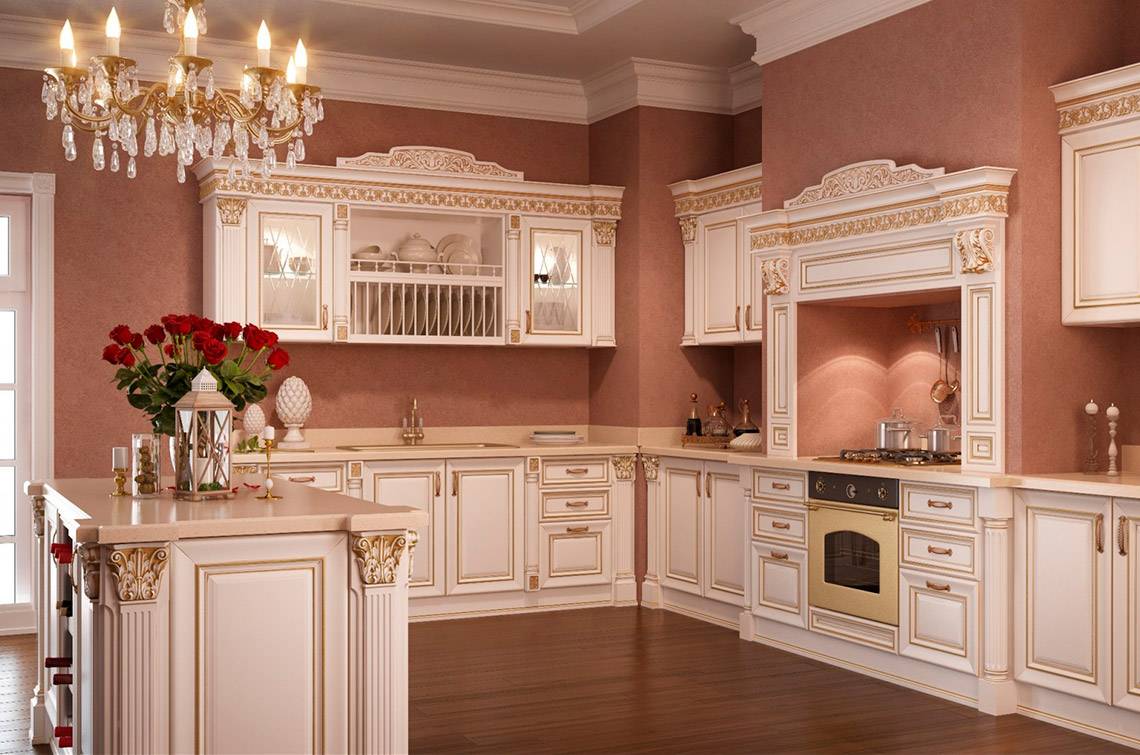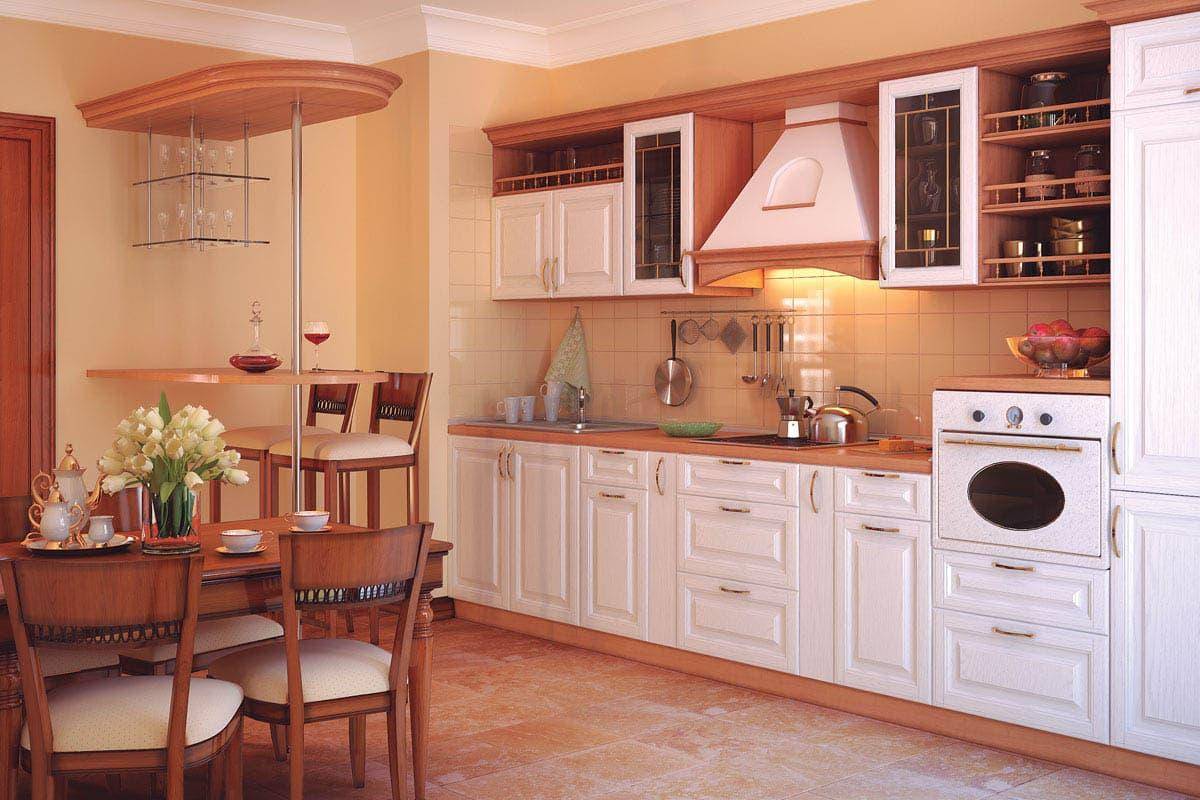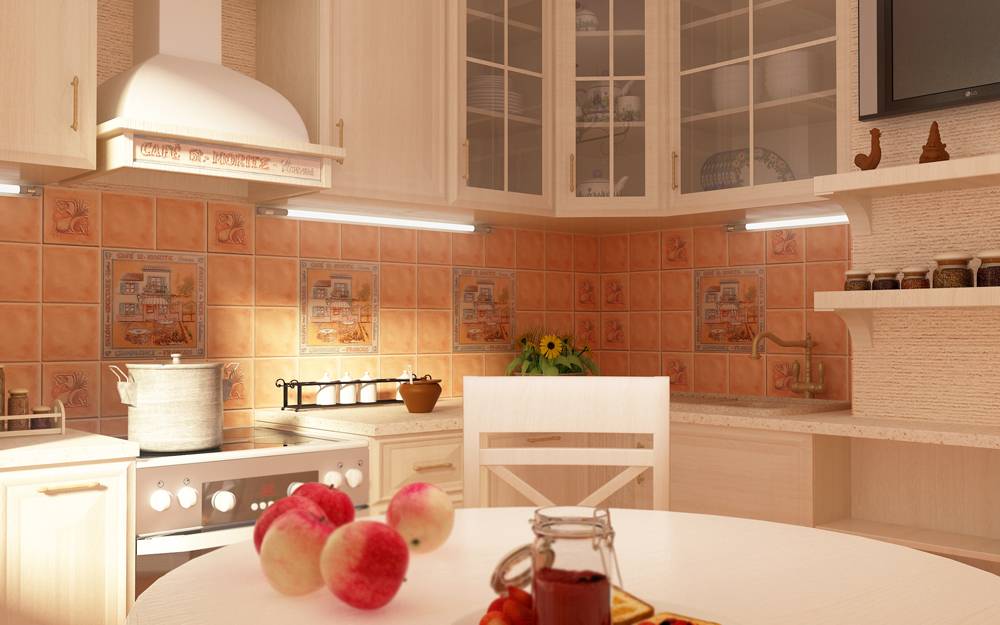 Рабочую зону для приготовления пищи стоит выделить белым, стол в таком интерьере рекомендуется сделать из мрамора, а рабочие поверхности стеклянными. Мебель лучше выдержать в цвете топленого молока. А вот полы в кухне можно сделать абрикосовыми. Сверху даже можно постелить мягкий ковер с ворсом средней длины.