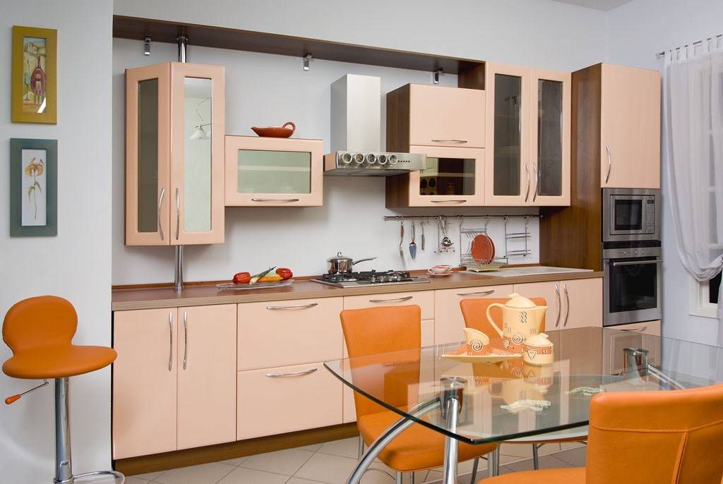 Персиковая кухня будет смотреться привлекательно, если дополнить ее мебелью, выполненной в салатовых, красных или оранжевых тонах. Главное – не переборщить, иначе интерьер будет смотреться нелепо.