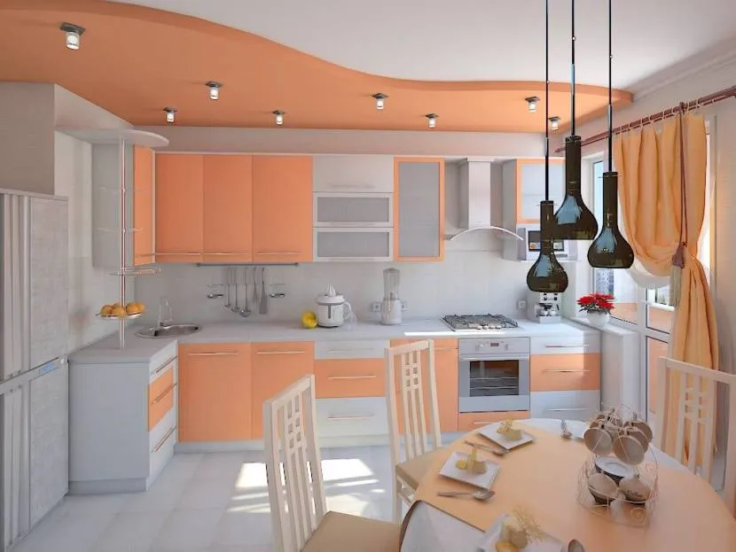 Персиковый с белым. Придаст интерьеру уют и покой. Белый оттенок добавит чистоты и света, что зрительно увеличит небольшую площадь. Такая кухня будет смотреться приятно и свежо. Белым стоит выделить стены или кухонный гарнитур.