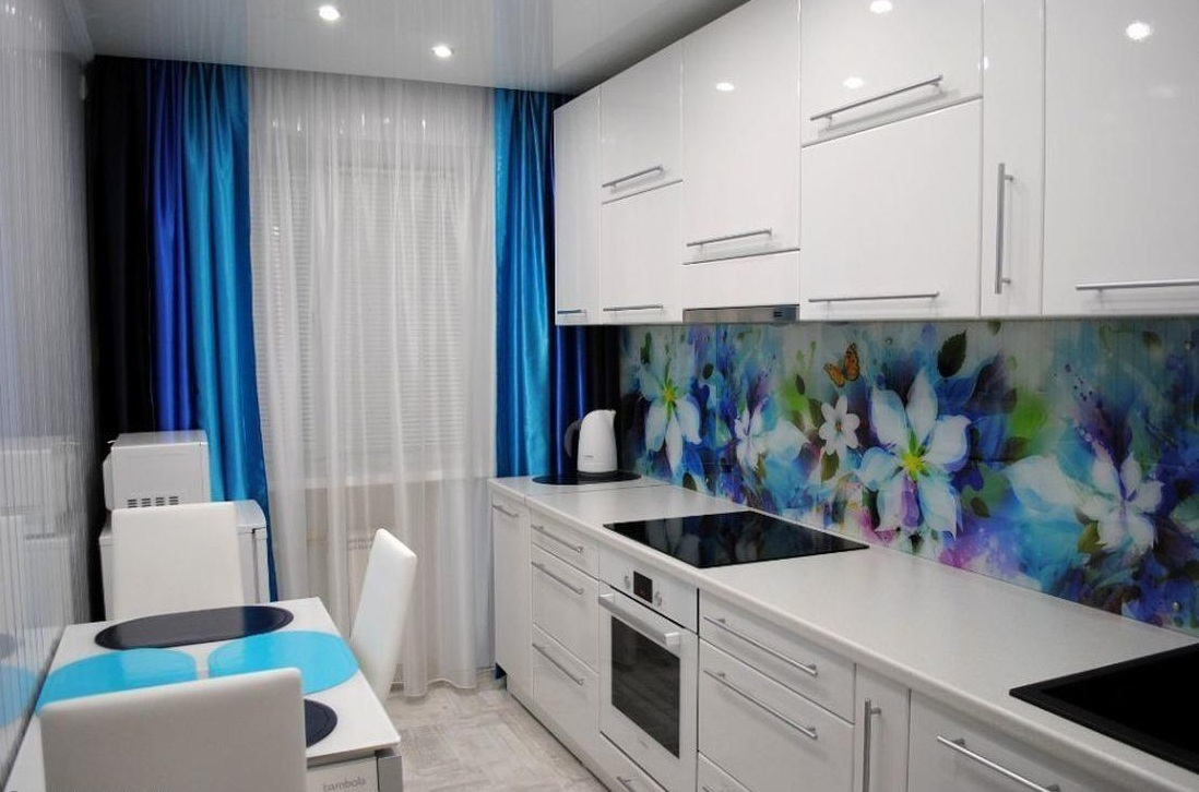 С помощью текстильного оформления можно освежить кухню, добавить ей легкости и воздушности. В кухне с окнами, выходящими на южную сторону, отличным вариантом станут шторы голубого цвета.