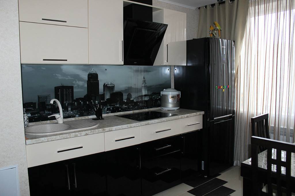 Стеклянный фартук может защищать окрашенную стену от брызг: этот вариант подходит кухням в стиле минимализм, где акцент на зоне готовки нежелателен. Также под стекло можно поместить изображения, фотографии, рецепты и обои.
