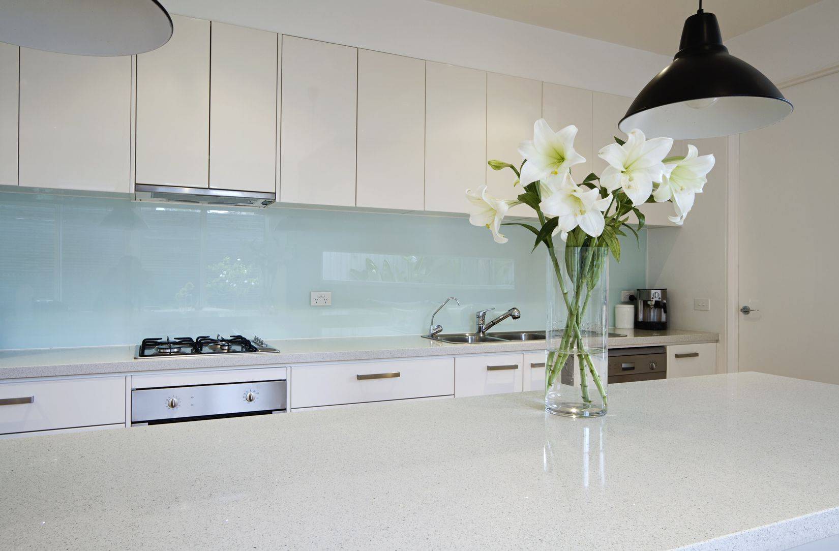 В сочетании со светлым гарнитуром стеклянный экран делает помещение более воздушным: и гладкая поверхность, и белые фасады успешно отражают свет, зрительно увеличивая кухню.