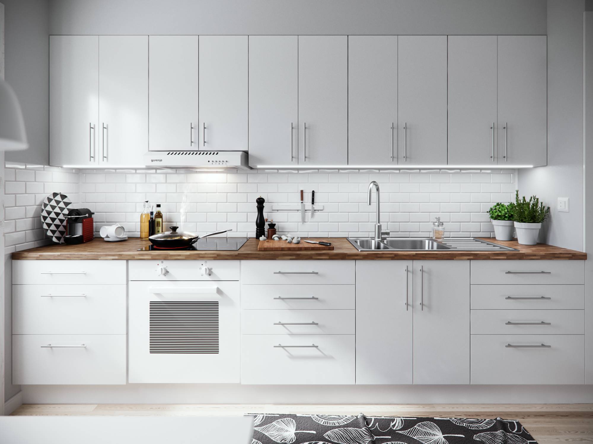 - на белом фоне будет отлично смотреться подсветка и любые кухонные принадлежности, которые можно разместить на рейлинге.