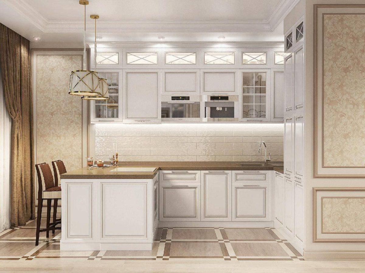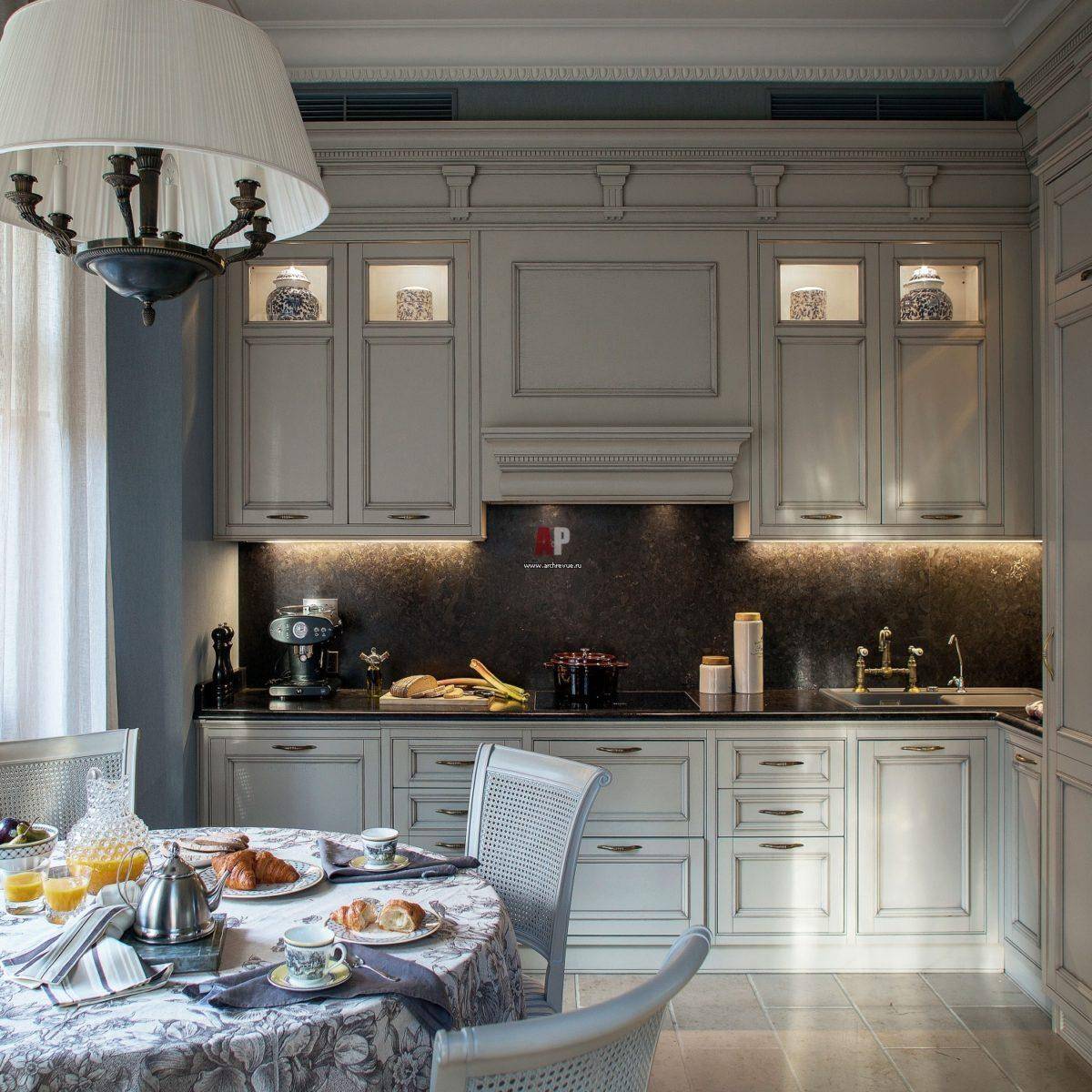 Верхние шкафы в современных адаптациях классики чаще делают до потолка. Это может быть реализовано с помощью добавочных секций по типу антресоли.