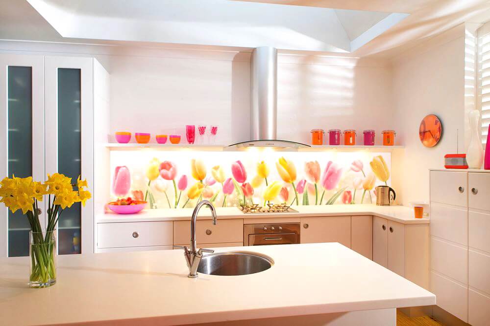 Такой относительно недорогой способ позволяет декорировать кухню изображениями фруктов или ягод, добавив обстановке яркости и сочности. Также популярна тема природы: лес, трава и капли дождя успокаивают и помогают достичь внутренней гармонии. Но, выбирая разноцветное изделие, стоит помнить о главном: кухня не должна смотреться перегруженной. Для этого лучше использовать лаконичный гарнитур и отделку.