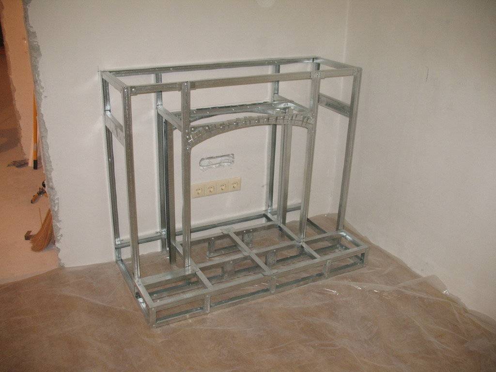 «Внутренности» каминной конструкции собираются отдельно. Если портал выполняется арочным, для его создания потребуются гибкие перфорированные профили, которые укладываются по контуру уже вырезанных деталей.