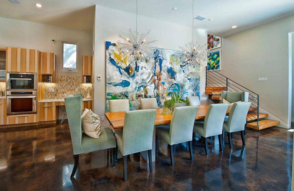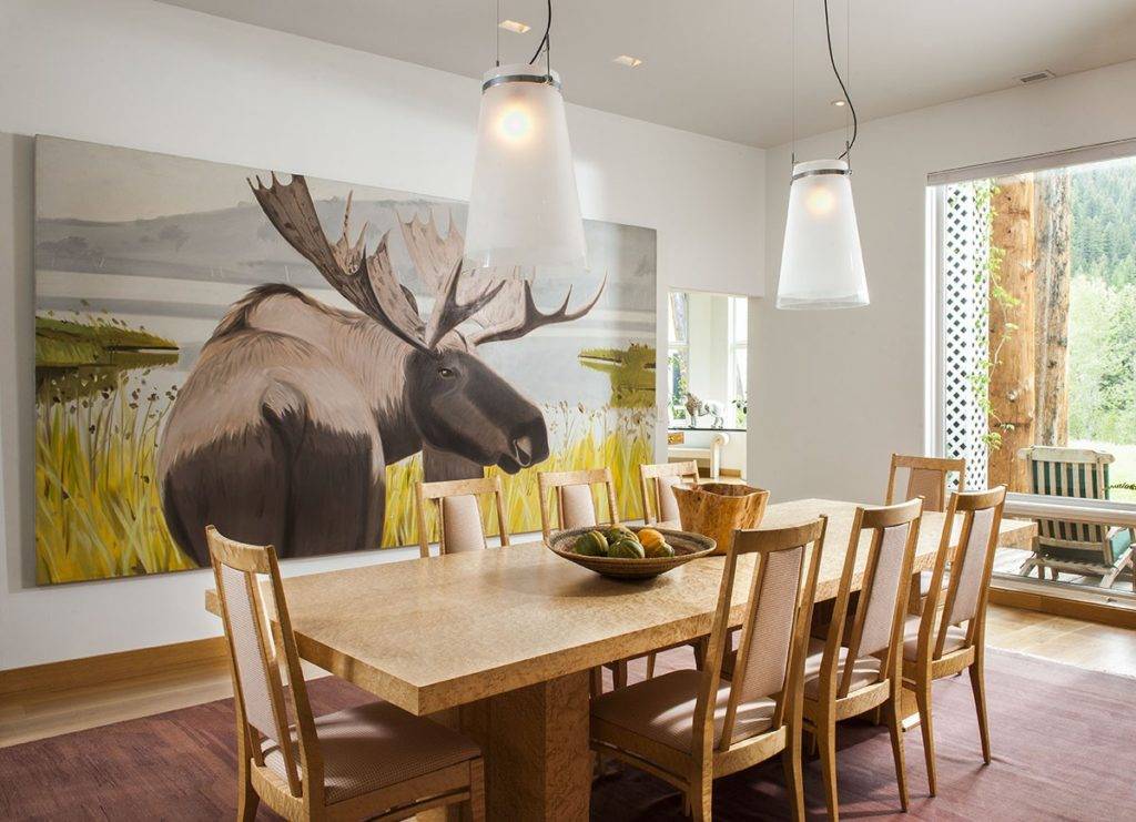 Картины над баром или обеденным столом можно вешать ниже уровня глаз, однако вплотную к столешнице размещать их не стоит. В противном случае вы рискуете измазать изображение. Из этих же соображений не стоит размещать рисунки над плитой и рабочей поверхностью.