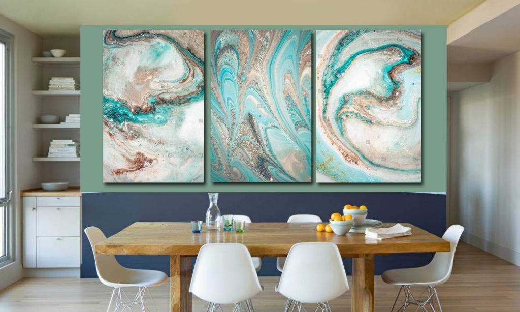 Не забывайте про модульные картины. В отличие от триптихов, они объединены одной идеей, но по смыслу не связаны. Развешивать их можно в любом порядке и последовательности, поэтому, как правило, они создают декоративный кластер на стене. Это актуально, например, в кантри.