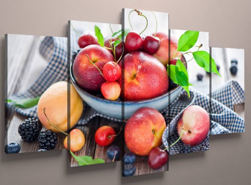 Совет: интерьер кухни должен вызывать у людей аппетит, но это вовсе не означает, что на полотне должно присутствовать изображение жареного поросенка. Даже красивый натюрморт, на котором художник нарисовал спелые фрукты, вызовет у человека желание что-либо съесть.