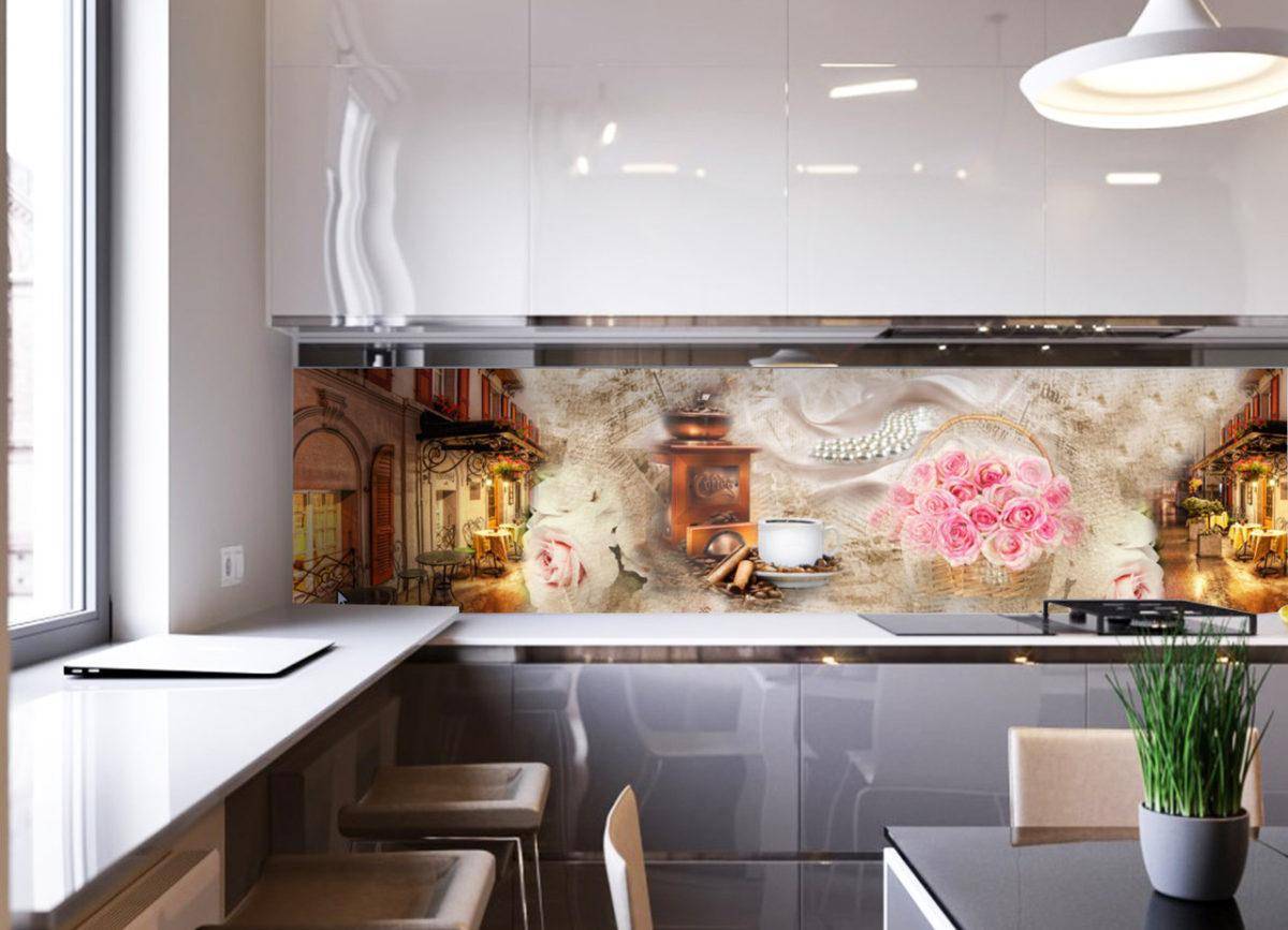 Если вы везучий обладатель огромной комнаты, то можно использовать 1 большой рисунок для кухни на всю стену. Это поможет еще сильнее увеличить комнату, наполнить ее красками и уютом.