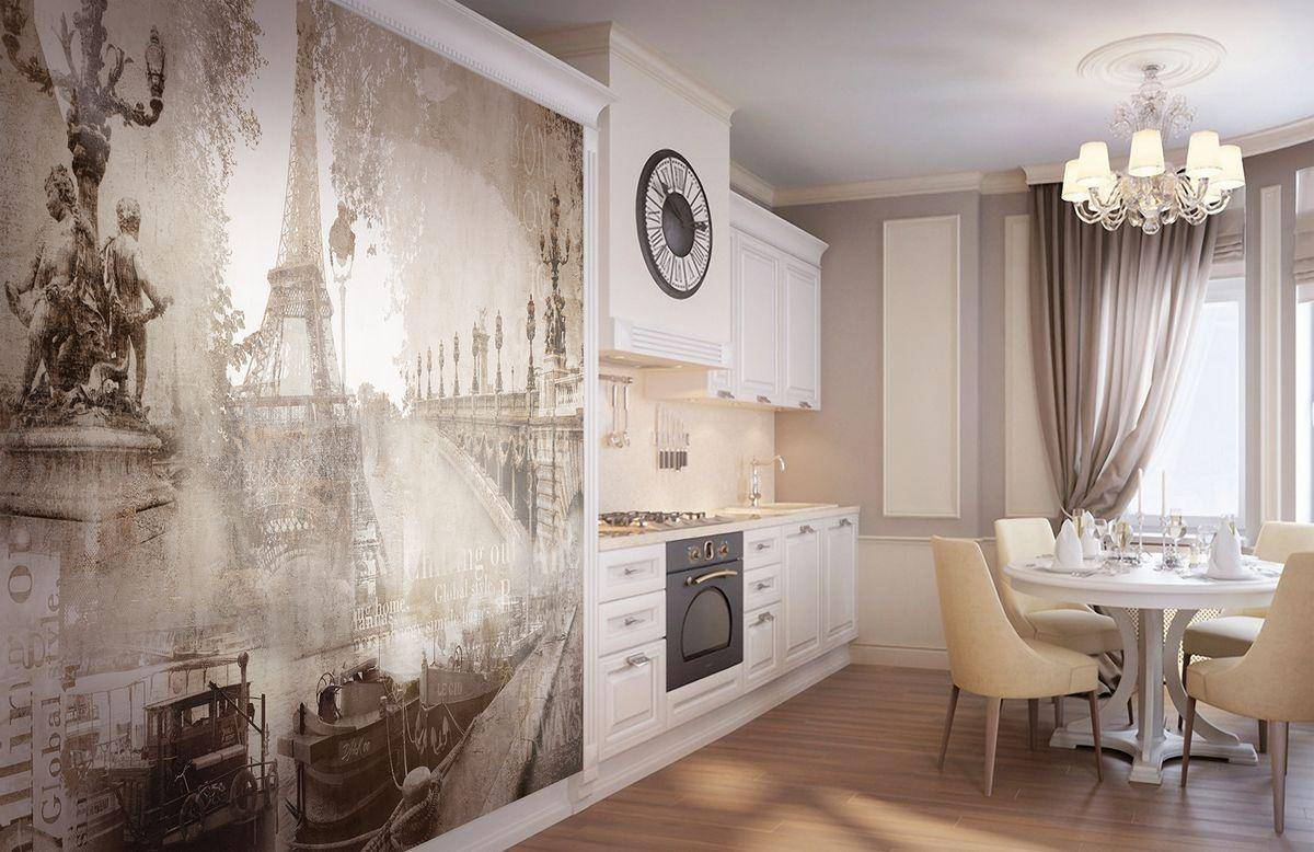 Допустим, представьте себе вариант: фотообои с видом французской старинной улочки, а рядом стулья на хромированных ножках, а на потолке люстра в стиле хай-тек. Казалось бы, это утрированное сравнение, но бывает и так!