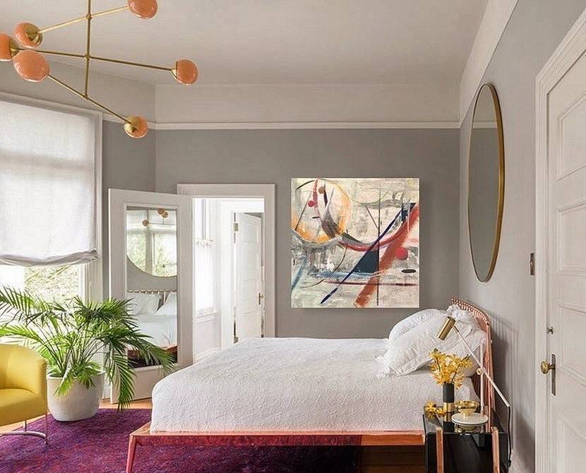 Старинные работы придают облику дома шарм, наделяет его атмосферой и историей. В оформлении опочивальни допустима продуманная небрежность, когда холсты стоят на полу, прислонённые к стене. Вернисаж выглядит, как будто собранный наспех, это добавляет лёгкость и творческую нотку. Кроме того, так можно быстро менять экспозицию, без новых дыр в стене.