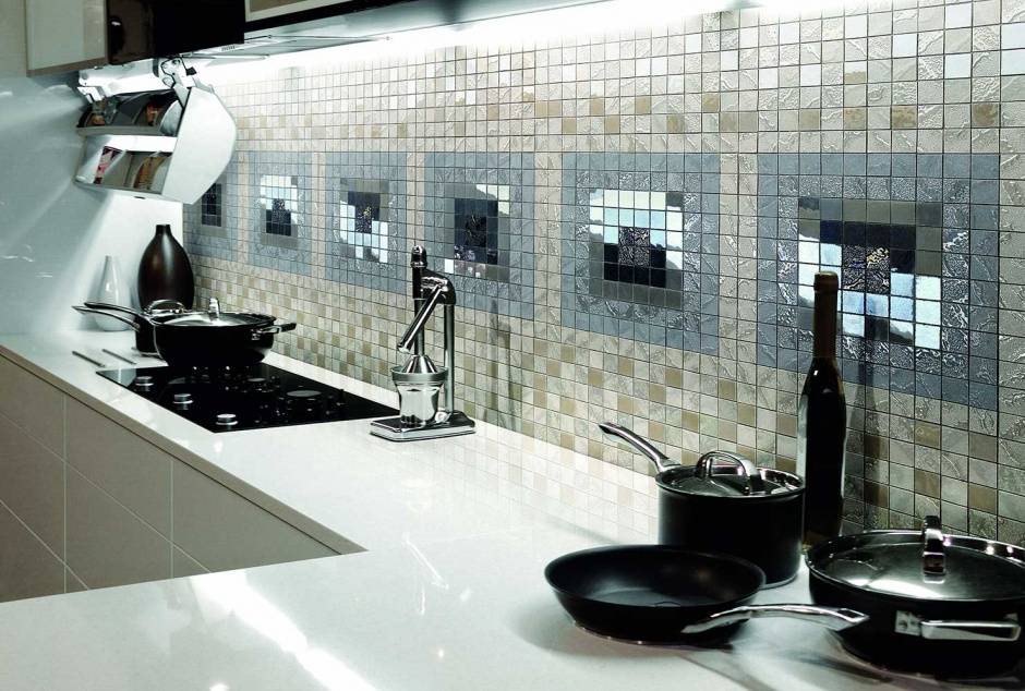 Зеркальная плитка на фартук кухни преследует больше декоративную цель, нежели практическую. Такая отделка способна расширить тесное кухонное пространство, но требует сверхбережной эксплуатации. Удалить масло и капли раскаленного жира с зеркального покрытия сложно, необходимы сноровка и специальные чистящие средства. Незначительные загрязнения (потеки, мутные круги и т.п.) на такой стене заметны гораздо сильнее, нежели на обычном кафеле. Прежде, чем клеить такую плитку, нужно взвесить все «за» и «против».