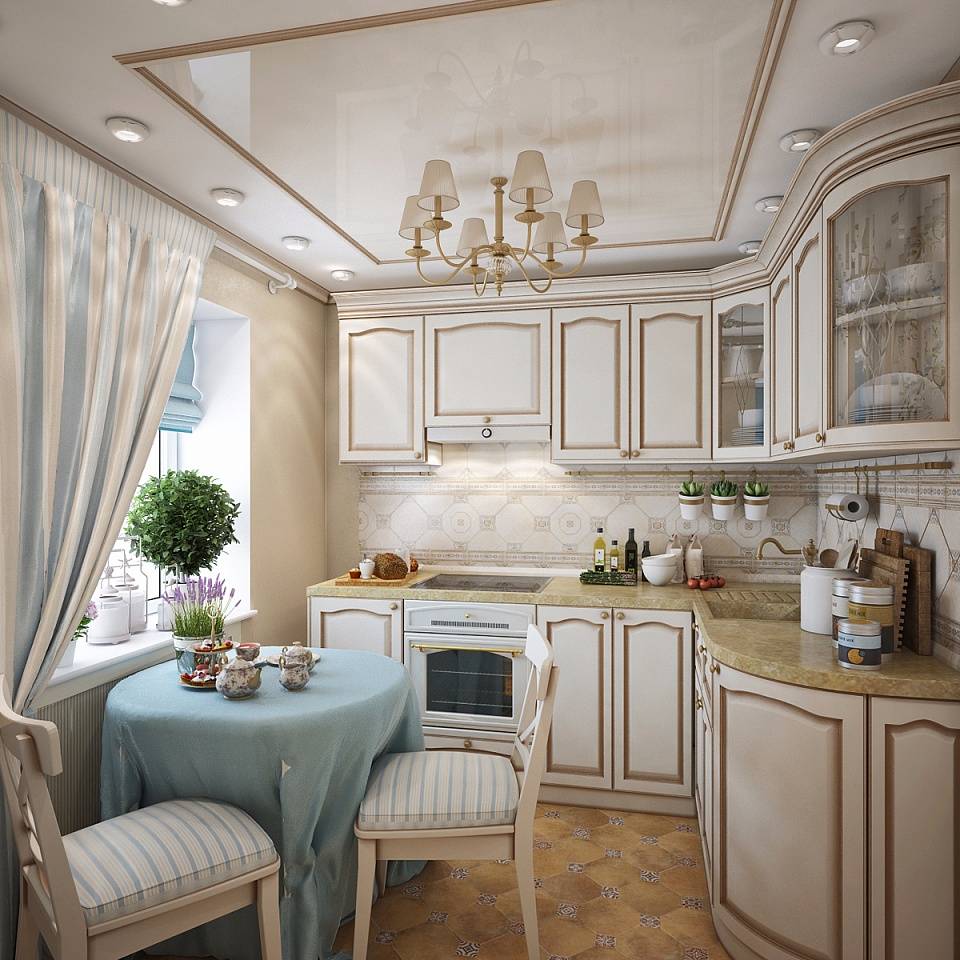 Дизайн маленькой кухни с угловым гарнитуром, выполненном в классическом стиле