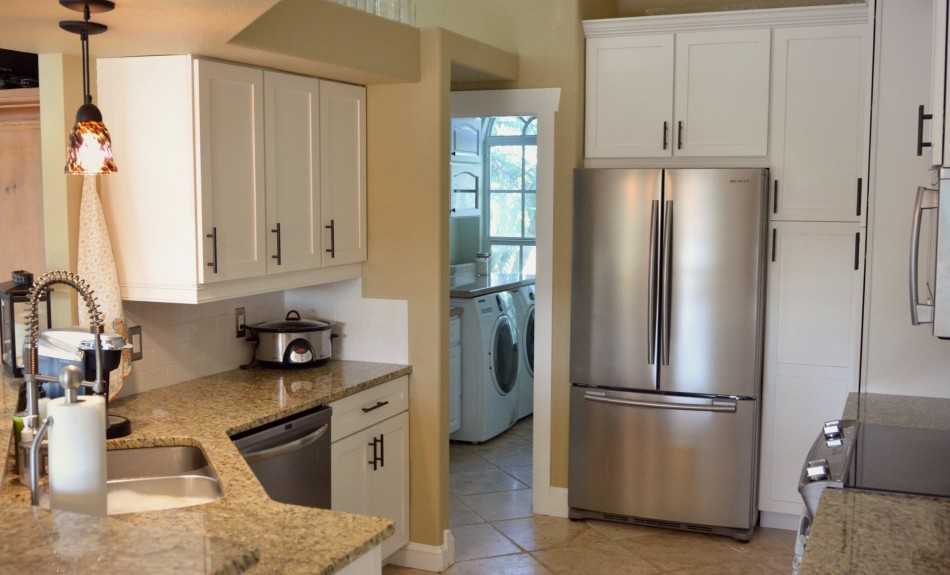 При типичной планировке кухни в хрущевке угловую секцию выполняют с 2 углами, устанавливая там мойку. На этапе обустройства комнаты практикуют разные методы размещения холодильника: у входа или возле оконного проема. Второй вариант предпочтительнее, поскольку у двери оборудование ставят при П-образной конфигурации комнаты.