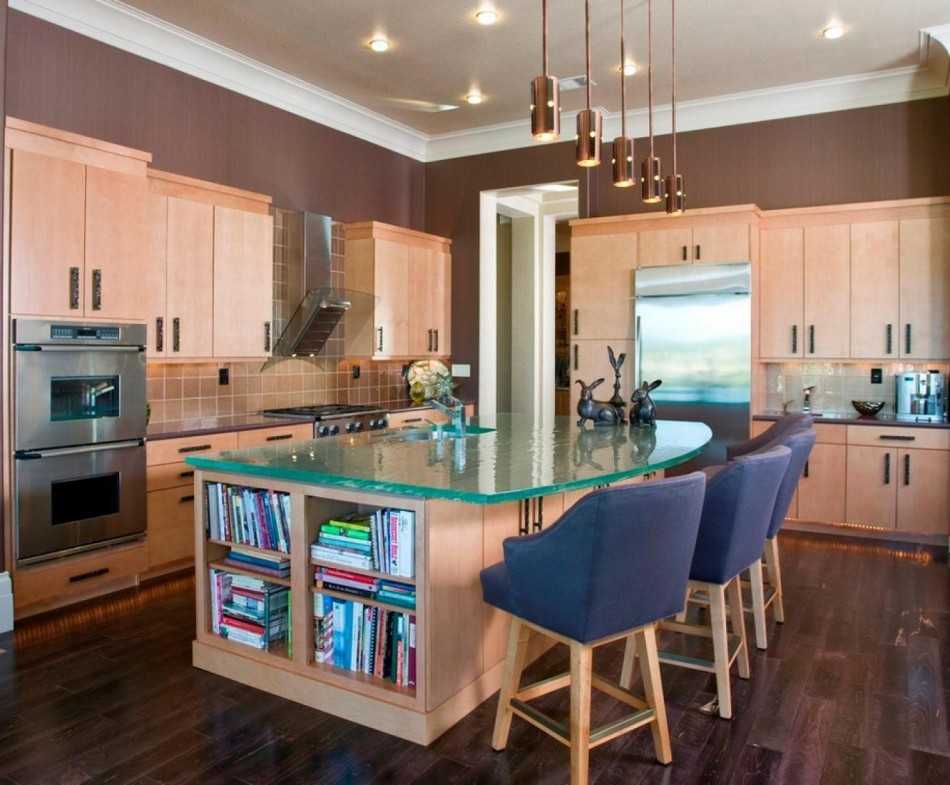 Островная планировка понравится владельцам больших кухонь или помещений, где зона для приготовления пищи совмещена с гостиной. В просторном интерьере такой вариант выглядит достаточно оригинально и практично.